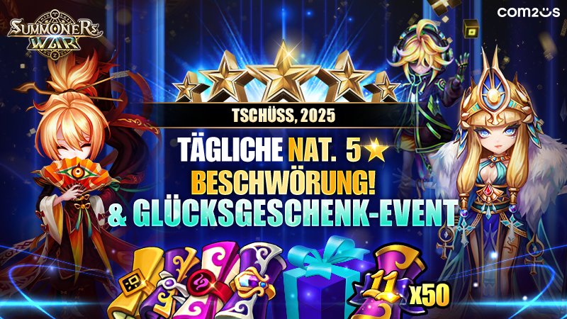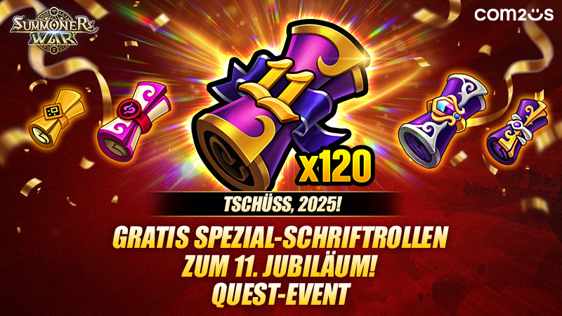 Hallo von Com2uS!Der Dezember ist da, um das Jahr 2025 festlich abzuschließen!Und um den Abschluss des Jahres 2025 gebührend zu feiern, haben wir das [Gratis Spezial-Schriftrollen zum 11. Jubiläum! Quest-Event] für euch vorbereitet, bei dem ihr [bis zu 120 Spezial-Schriftrollen zum 11. Jubiläum] sowie weitere Belohnungen wie [1 Legendäre alle Attribute-Schriftrolle, 1 Licht & Dunkel Schriftrolle und 1 Legendäre Schriftrolle] erhalten könnt.Im Folgenden findet ihr weitere Informationen dazu.■ Event-Zeitraum1. Dezember 2025, 03:00 Uhr - 4. Januar 2026, 15:59 Uhr (MEZ)* Belohnungen verfügbar bis: 5. Januar 2026, 15:59 Uhr (MEZ)■ Details zum Event<Wie man Punkte erhält>- Pro Spiel in der [Arena]: 2 Punkte (Bis zu 500 Punkte erhältlich)- Pro Spiel im [Arena Interserver-Kampf]: 10 Punkte (Bis zu 500 Punkte erhältlich)- Pro Spiel in der [Welt-Arena (Rangkampf, Herausforderungskampf, Sonderliga)]: 20 Punkte (Bis zu 1.500 Punkte erhältlich)- Pro Spiel im [Belagerungskampf]: 20 Punkte (Bis zu 1.000 Punkte erhältlich)- Pro Spiel im [Welt-Gildenkampf]: 25 Punkte (Bis zu 500 Punkte erhältlich)* Es können insgesamt bis zu 2.000 Punkte erhalten werden. <Zeitplan der Inhalte><Belohnungen für insgesamt erhaltene Punkte>Insgesamt 100 Punkte erhalten: 10 Spezial-Schriftrollen zum 11. JubiläumInsgesamt 200 Punkte erhalten: 10 Spezial-Schriftrollen zum 11. JubiläumInsgesamt 300 Punkte erhalten: 10 Spezial-Schriftrollen zum 11. Jubiläum + 10 Mystische SchriftrollenInsgesamt 400 Punkte erhalten: 10 Spezial-Schriftrollen zum 11. JubiläumInsgesamt 600 Punkte erhalten: 10 Spezial-Schriftrollen zum 11. JubiläumInsgesamt 800 Punkte erhalten: 10 Spezial-Schriftrollen zum 11. Jubiläum + 1 Licht & Dunkel SchriftrolleInsgesamt 1.000 Punkte erhalten: 10 Spezial-Schriftrollen zum 11. JubiläumInsgesamt 1.200 Punkte erhalten: 10 Spezial-Schriftrollen zum 11. JubiläumInsgesamt 1.400 Punkte erhalten: 10 Spezial-Schriftrollen zum 11. Jubiläum + 1 Legendäre SchriftrolleInsgesamt 1.600 Punkte erhalten: 10 Spezial-Schriftrollen zum 11. JubiläumInsgesamt 1.800 Punkte erhalten: 10 Spezial-Schriftrollen zum 11. JubiläumInsgesamt 2.000 Punkte erhalten: 10 Spezial-Schriftrollen zum 11. Jubiläum + 1 Legendäre alle Attribute-Schriftrolle★ Was ist die Spezial-Schriftrolle zum 11. Jubiläum?​Eine besondere Schriftrolle zur Feier des 11-jährigen Jubiläums von Summoners War.Ein zufälliges Nat. 3-5★ Monster aus den Attributen Feuer, Wasser, Wind, Licht oder Dunkel wird nach den entsprechenden Wahrscheinlichkeiten beschworen.※ Bitte beachten- Welt-Arena: Der Welt-Arena Rangkampf, Herausforderungskampf, und die Sonderliga werden gezählt, der Freundeskampf der Welt-Arena wird jedoch nicht gezählt.- Die Belohnungen sind bis 24 Stunden nach Beendigung des Events verfügbar.- Bitte starte das Spiel neu, wenn du zu Beginn des Events spielst, um Verzögerungen zu vermeiden. - Bitte versuche, das Spiel neu zu starten, wenn du deine Belohnung nicht in deinem Posteingang sehen solltest. - Die Dauer und die verbleibende Zeit des Events werden in der Zeitzone der Region angezeigt, in der sich dein Wohnsitz befindet.- Bei Fragen oder Anmerkungen wende dich bitte an unseren Kundendienst unter https://customer.withhive.com/com2us/ask/313​