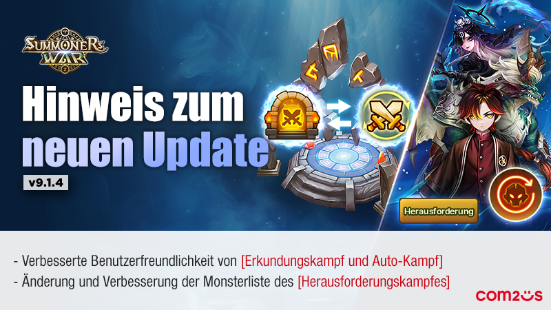 UPDATE Hinweis zum neuen Update v9.1.4Hallo von Com2uS! Summoners War wurde auf v9.1.4 aktualisiert. Die Details dazu sind im Folgenden zu finden! * Das eigentliche Update wird durch ein automatisches Update während der Wartung durchgeführt. (Android/iOS) * Details können über den Wartungshinweis überprüft werden. ====================================== Details zum Update v9.1.4======================================▶ Verbesserungen am [Erkundungskampf/Auto-Kampf]- Es wurde eine Funktion hinzugefügt, mit der ihr zwischen dem Erkundungskampf- und dem Auto-Kampf-Bildschirm wechseln könnt.: Über die Wechsel-Schaltfläche im jeweiligen Kampf-Popup könnt ihr frei zwischen Erkundungskampf und Auto-Kampf wechseln. Auch während eines laufenden Auto-Kampfes könnt ihr somit die Belohnungen des Erkundungskampfes einsehen.- Es wurde eine Funktion hinzugefügt, mit der ihr während eines laufenden Auto-Kampfes einen Erkundungskampf reservieren könnt.: Ruft während eines Auto-Kampfes das Menü des Erkundungskampfes auf, wählt das gewünschte Gebiet und die Dauer aus und tippt auf "Kampf beginnen“, um den Erkundungskampf zu reservieren.: Der reservierte Erkundungskampf startet automatisch, sobald der aktuell laufende Auto-Kampf beendet ist.▶ Die Funktionen "Serien-Aufarbeitung“ und "Serien-Umwandlung“ für [Runen/Artefakte] wurden hinzugefügt- Ihr könnt gewünschte Eigenschaften festlegen und bis zu 10 Mal automatisch aufarbeiten oder umwandeln, bis mind. 1 der festgelegten Eigenschaften erscheint.1) Menü aufrufen: Die Serien-Aufarbeitung findet ihr unter [Rune: Aufwerten > Aufarbeitung] bzw. [Artefakt: Umwandlung > Aufarbeitung].: Die Serien-Umwandlung findet ihr unter [Artefakt: Umwandlung > Normale Umwandl.].2) Eigenschaften festlegen: Im Auswahlfenster könnt ihr die gewünschten Eigenschaften festlegen. Eine Mehrfachauswahl sowie das Festlegen von Wertebereichen sind möglich.* Bei der Serien-Aufarbeitung können keine Eigenschaften ausgewählt werden, die bei den entsprechenden Runen/Artefakten durch Aufarbeitung sowieso nicht erscheinen können.3) Aufarbeitung / Umwandlung durchführen: Der jeweilige Vorgang läuft automatisch ab, bis eine der folgenden drei Bedingungen erfüllt ist:- Mindestens 1 Eigenschaft, die den festgelegten Bedingungen entspricht, ist erschienen- Alle 10 Durchgänge wurden abgeschlossen- Sämtliche der für die Aufarbeitung/Umwandlung benötigten Materialien wurden verbraucht* Bei der Aufarbeitung/Umwandlung werden Manasteine verbraucht. Bei Artefakten werden für die Umwandlung zusätzlich Umwandlungssteine und für die Aufarbeitung zusätzlich Magie-Fragmente verbraucht.* Ihr könnt einen Vorgang jederzeit über die Anhalten-Schaltfläche abbrechen.4) Ergebnis prüfen: Es werden sowohl die bisherigen Eigenschaften sowie die neu erschienenen Eigenschaften (entsprechend den festgelegten Bedingungen) auf dem Bildschirm angezeigt. Ihr könnt eine der beiden Optionen auswählen und bestätigen.▶ Weitere Verbesserungen und Änderungen- Unter [Profil > Protokoll] werden Rekorde nun bis auf die Stunde genau angezeigt.- Unter [Herausforderungskampf > Wiedergabe] könnt ihr bei der Wiederholung nun die jeweiligen Herausforderungsmonster beider Seiten einsehen.▶ [Arena] Der Kampfbildschirm wurde auf ein besonderes Motiv zur Kollabo mit Der Herr der Ringe umgestellt- Anwendungszeitraum: Nach dem Patch zum Update v9.1.4 am 25.02. - 01.04., 16:59 Uhr (MESZ)- Das Saison-Motiv kann unter [Einstellungen > Optionen > Andere Einstellungen] auf EIN/AUS (ON/OFF) gesetzt werden.- Das Motiv für den Winter, das auf [Arena / Welt-Arena / Rivalen-Gildenkampf / Belagerungskampf] angewendet wurde, wurde beendet.▶ Ab dem 2. März wird die Kollabo-Event-Währung in "Der Herr der Ringe"-Token geändert.- Über die Kollabo-Events können ab dem 02.03. um 00:00 Uhr (Serverzeit) statt den bisherigen "Der Herr der Ringe"-Münzen nur noch die neuen "Der Herr der Ringe"-Token gesammelt werden.- Betroffene Inhalte:: [Event-Dungeon] Land der Schatten / Kollabo-Missionen / Arena-Rivale Beschwörer X / Finde den Ring Arena-Event: Die neuen "Der Herr der Ringe"-Token können auf der Kollabo-Event-Seite gegen verschiedene Items eingetauscht werden.※ Die vorherige Währung "Der Herr der Ringe"-Münzen kann noch bis zum 08.03. um 23:59 Uhr (Serverzeit) verwendet werden. Danach verfallen diese Münzen. Bitte tauscht eure Münzen also unbedingt rechtzeitig auf der entsprechenden Event-Seite ein.▶ Zur Kollabo wurde eine Formwandlung für Aragorn hinzugefügt.- Diese besondere Formwandlung ist nur während des Kollabo-Zeitraums als Belohnung über ein Kollabo-Event erhältlich, welches für Anfang März geplant ist. Sichert sie euch also unbedingt innerhalb des Event-Zeitraums.▶ Event-Gebäude zur Kollabo "Mathom-Haus" wurde hinzugefügt.- In diesem Gebäude können 5 Monster platziert werden. Es kann als Belohnung über ein Kollabo-Event erhalten werden, welches für Anfang März geplant ist.▶ Es wurden neue Emojis mit Gesichtsausdrücken der Kollabo-Charaktere aus Der Herr der Ringe hinzugefügt.- Über ein Kollabo-Event, welches für Anfang März geplant ist, könnt ihr 5 Emojis als Belohnung erhalten. Nehmt also unbedingt innerhalb des Event-Zeitraums teil.▶ [Welt-Arena] Ab dem 1. März beginnt eine neue Saison des Herausforderungskampfes.- Zeitraum: 01. März, 09:00 Uhr (MEZ) - 30. März, 16:59 Uhr (MESZ)* Nach einer Ruhephase vom 28. Februar, 16:00 Uhr - 01. März, 08:59 Uhr (MEZ) startet die Saison um 09:00 Uhr (MEZ) gleichzeitig auf allen Servern. (* Während der Ruhephase werden Ranglisten und Rekorde zurückgesetzt.)- Der Zeitplan für die Aktualisierung der Missionsbelohnungen des Herausforderungskampfes ist wie folgt:- Die in dieser Saison verfügbaren Herausforderungsmonster lauten wie folgt:* Diese Herausforderungsmonster sind bis zum 30. April, 16:59 Uhr (MESZ) verfügbar und werden mit Beginn der neuen Saison am 01. Mai, um 09:00 Uhr (MESZ) ersetzt.* Die Der H