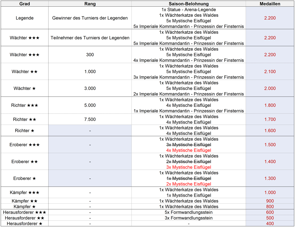 - Die Belohnungen für Saison 36 nach der Überarbeitung der Welt-Arena sind nachfolgend aufgeführt.