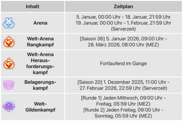 - Arena + Welt-Arena: Arena-Kampf und Rivalen-Kampf, Welt-Arena Rangkampf, Interserver-Kampf sowie der Herausforderungskampf werden gezählt. Der Freundeskampf der Welt-Arena wird jedoch nicht gezählt.