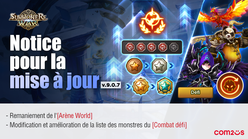 Salutations de Com2uS !La mise à jour v.9.0.7 de Summoners War a été effectuée.Retrouvez ci-dessous les détails de cette mise à jour.* Le contenu de la mise à jour sera appliqué lors de la maintenance prévue pour la mise à jour automatique. (Android / iOS simultanément)* Pour plus de détails, veuillez vous référer à l’annonce de maintenance.======================================Détails de la mise à jour v.9.0.7======================================​​​​​▶ [Arène World] À partir de la saison 36, qui débutera le 5 janvier 2026, l’Arène World fera l’objet d’un important remaniement.- Nous vous présentons les principaux changements de la saison 36.=================================- Calendrier de la saison 36 de l’Arène WorldDébut prévu le 05/01/2026 à 09:00 pour une fin prévue le 28/03/2026 à 08:00 (heure de Paris)- Le système de promotion pour les grades [Challenger ★ à Conquérant ★★★] sera remanié.: Les points de victoire seront supprimés, et les promotions se feront désormais via des médailles obtenues selon le résultat des combats.: Une promotion sera accordée dès qu’un certain nombre de médailles sera atteint pour chaque grade. Une fois promu, aucune rétrogradation vers un grade inférieur n’aura lieu, même en cas de défaite.: Dans cette tranche de grades, les informations de classement ne seront plus affichées.- Il sera possible d’obtenir des médailles de gloire en fonction du résultat du combat même en cas de défaite.: En cas de défaite, les médailles de gloire obtenues varieront désormais selon le nombre de monstres adverses encore en vie au moment où l’issue du combat est décidée.- L’affichage des valeurs des médailles de gloire sera ajusté à un multiplicateur x2 par rapport à celui existant.: Les médailles de gloire déjà détenues ainsi que celles obtenues en récompense seront affichées avec des valeurs doublées, sans modification de la valeur réelle des récompenses.- Les combats de placement de l’Arène World seront supprimés.: Les invocateurs participant pour la première fois à l’Arène World commenceront au grade Challenger ★ (0 médaille).: Pour les invocateurs disposant d’un historique de saison précédente, le grade initial sera déterminé selon les points de victoire de la saison passée et les critères de compression des grades.=================================- Le système de promotion pour la tranche de grades [Challenger ★ à Conquérant ★★★] sera modifié.: Auparavant, il fallait remplir simultanément des conditions de points de victoire et de classement propres à chaque grade pour être promu au grade suivant. À partir de la saison 36, les points de victoire ne s’appliqueront plus dans la tranche de grades [Challenger ★ à Conquérant ★★★], et la promotion se fera désormais en fonction du nombre de [médailles] détenues, et obtenues selon le résultat des combats.- Les variations de médailles selon le résultat du combat seront les suivantes.: En cas de victoire - obtention de 1 médaille: En cas de défaite - perte de 1 médaille- Dans la tranche de grades [Challenger ★ à Conquérant ★★★] où s’applique le système de promotion basé sur les médailles, les informations affichées dans le lobby de l’Arène World seront modifiées comme suit.​- Voici plus d'explications sur le système de promotion basé sur les médailles.: Chaque grade commencera avec 0 médaille. Lorsque le nombre de médailles requis pour un grade est atteint, vous êtes promu au grade suivant, et le nombre de médailles est alors réinitialisé à 0.Par exemple, en atteignant 4 médailles au grade Combattant ★★, vous serez promu au grade Combattant ★★★, et votre nombre de médailles sera réinitialisé à 0.: Dans la tranche de grades [Challenger ★ à Conquérant ★★★], aucune rétrogradation vers un grade inférieur n’aura lieu, même en cas de défaite.- À l’écran de fin de combat, vous pourrez consulter l’état de vos médailles en fonction du résultat du combat.​- La tranche des grades [Justicier ★ à Légende] conservera le système existant basé sur les points de victoire et le classement.: Lorsque le nombre de médailles atteintes au grade Conquérant ★★★ atteint 5, vous êtes promu au grade Justicier ★. À partir de ce stade, les critères existants basés sur les points de victoire et le classement s’appliqueront.: Dans la tranche de grade Justicier ★, aucune rétrogradation vers Conquérant ★★★ n’aura lieu, même en cas de défaite.: À partir des grades supérieurs à Justicier ★, les changements de grade s’effectueront comme auparavant, en fonction des points de victoire et du classement.- Voici les nouveaux critères par grade modifiés suite à la refonte de la structure de promotion :: Le grade minimum « Débutant » a été supprimé, et la promotion dans la tranche de grades Challenger ★ à Conquérant ★★★ se fera désormais via les médailles possédées.: Les points de victoire ont été ajustés pour la tranche des grades Justicier ★ à Gardien ★★★, et le critère de classement du grade Justicier ★ a été supprimé.- Maintenant, nous vous expliquons les règles de réduction des points de victoire et des médailles en cas de non-participation aux combats de classement.[Grades Challenger ★ à Conquérant ★★★]: En cas de non-participation aux combats de classement pendant 7 jours, le nombre de médailles diminuera ensuite de 1 par jour.* Dès la reprise des combats de classement, la diminution des médailles s’arrêtera. À noter que le nombre de médailles ne pourra pas descendre en dessous de 0.[Grades Justicier ★ à Légende]: En cas de non-participation aux combats de classement pendant 7 jours, les points de victoire diminueront de 5 par jour.: En cas de non-participation aux combats de classement pendant 14 jours, les points de victoi