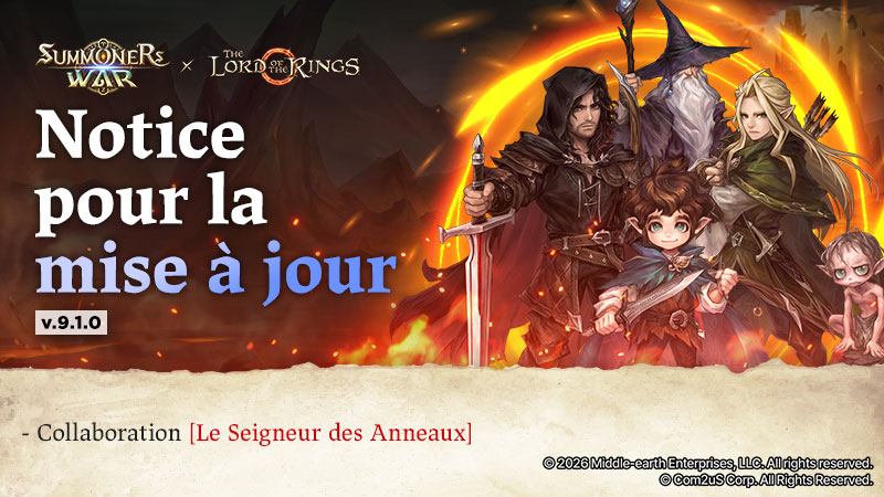 OTHERS Notice préliminaire de collaboration avec Summoners WarSalutations de Com2uS !La collaboration [Summoners War X Le Seigneur des Anneaux] débutera le 29 janvier 2026 !Quels personnages du Seigneur des Anneaux viendront sur l’Île céleste ?Nous comptons sur votre intérêt pour cette collaboration !Merci, et à bientôt dans l'île céleste !