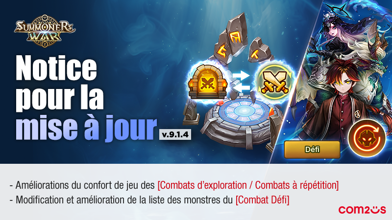 UPDATE Notice pour la mise à jour v.9.1.4Salutations de Com2uS !La mise à jour v.9.1.4 de Summoners War a été effectuée.Retrouvez ci-dessous les détails de cette mise à jour.* Le contenu de la mise à jour sera appliqué lors de la maintenance prévue pour la mise à jour automatique. (Android / iOS simultanément)* Pour plus de détails, veuillez vous référer à l’annonce de maintenance.======================================Détails de la mise à jour v.9.1.4======================================▶ Améliorations apportées aux [Combats d’exploration / Combats à répétition].- Une fonctionnalité permettant de passer d’un écran à l’autre entre les Combats d’exploration et les Combats à répétition a été ajoutée.: Grâce au bouton de bascule dans le pop-up de chaque type de combat, vous pourrez passer librement entre les écrans des Combats d’exploration et des Combats à répétition, et consulter directement les récompenses des Combats d’exploration même pendant des Combats à répétition.- Une fonctionnalité permettant de réserver des Combats d’exploration pendant des Combats à répétition a été ajoutée.: Pendant des Combats à répétition, accédez au menu des Combats d’exploration, sélectionnez la zone et l’heure souhaitées, puis appuyez sur le bouton de démarrage du combat pour réserver des Combats d’exploration.: Les Combats d’exploration réservés démarreront automatiquement une fois les Combats à répétition en cours terminés.▶ Ajout des fonctions de réévaluation en série et de conversion en série pour les [runes/artéfacts].- Vous pouvez définir les propriétés souhaitées, puis effectuer automatiquement jusqu’à 10 réévaluations ou conversions, jusqu’à ce qu'au moins 1 de ces propriétés apparaisse.1) Accéder au menu: La réévaluation en série est disponible dans les menus [Rune : Amélioration > Réévaluation] [Artéfact : Conversion > Réévaluation].: La conversion en série est disponible dans le menu [Artéfact : Conversion > Conv. normale].2) Réglage des propriétés: Sur l’écran de sélection des propriétés, vous pouvez définir les propriétés souhaitées, avec sélection multiple et réglage de la plage des propriétés possibles.* Pour la réévaluation en série, vous ne pouvez pas sélectionner les propriétés qui ne peuvent pas apparaître via la réévaluation sur la rune/l’artéfact concerné.3) Procéder à la réévaluation ou à la conversion: Le processus se poursuit automatiquement jusqu’à ce que l’une des trois conditions suivantes soit remplie.- {Au moins 1} propriété correspondant aux propriétés définies est apparue- Les 10 tentatives ont été effectuées- Tous les matériaux nécessaires à la réévaluation/conversion ont été épuisés* Des pierres de mana sont consommées lors de la réévaluation/conversion. Pour les artéfacts, des pierres de conversion sont également consommées lors de la conversion, et des fragments magiques lors de la réévaluation.* Pendant le processus, vous pouvez appuyer sur le bouton d’arrêt pour annuler à tout moment.4) Vérifier les résultats: Les propriétés existantes et les nouvelles propriétés apparues selon les conditions définies s’affichent ensemble, et vous pouvez en sélectionner une pour la confirmer.▶ Autres améliorations et changements.- [Profil > Historique] Les meilleurs records sont désormais affichés à la seconde près.- [Combat Défi > Replay] Lors d’un visionnage, vous pouvez désormais vérifier les monstres de défi attribués aux deux camps pour chaque match.▶ Remplacement de l'écran de combat de l’[Arène] par un thème spécial de la collab Le Seigneur des Anneaux.- Période d’application : après l’application du patch de la mise à jour v.9.1.4 le 25/02, jusqu’au 01/04 à 16:59 (heure de Paris)- Vous pouvez activer/désactiver le thème de saison dans le menu des Paramètres du jeu. (Paramètres du jeu > Options > Autres)- Le thème limité de la saison d’hiver, appliqué aux contenus de combat [Arène/Arène World/Rivaux de guilde/Combats d’occupation] n'est plus disponible.▶ À partir du 2 mars, les devises de la collab seront remplacées par les « Insignes Le Seigneur des Anneaux ».- Les « Pièces Le Seigneur des anneaux » obtenues via les évènements de la collab seront remplacées par les « Insignes Le Seigneur des anneaux » et remis à partir du 02/03 à 00:00 (heure du serveur).- Contenus concernés: [Donjon évènementiel] Terre des ombres / Missions de la collab / Rival de l’Arène Maître X / Événement d’Arène « Trouvez l’Anneau »: Les « Insignes Le Seigneur des anneaux » nouvellement remis peuvent être échangés contre divers objets sur la page de l’événement de la collab.※ Les « Pièces Le Seigneur des anneaux » déjà en votre possession peuvent être utilisées jusqu’au 08/03 à 23:59, mais ne pourront plus l’être après cette date ; veuillez donc vous assurer de les utiliser via la page de l’événement avant la fin de la période.▶ Ajout d'une métamorphose spéciale d’Aragorn- Il s’agit d’une métamorphose spéciale disponible pour une durée limitée pendant la collab. Elle est offerte en récompense via l’évènement spécial collab dédié prévu pour début mars. N’hésitez pas à y participer !▶ Ajout du bâtiment évènement spécial collab : « Maison des Mathoms ».- Il s’agit d’un bâtiment permettant de placer 5 monstres, que vous pouvez obtenir en récompense via l’évènement spécial collab dédié prévu pour début mars.▶ Ajout d’émoticônes représentant diverses expressions des personnages de la collab Le Seigneur des anneaux.- Vous pouvez obtenir 5 émoticônes en récompense via l’évènement spécial collab dédié prévu pour début mars, alors n’hésitez pas à y participer pendant la période de l’événement.▶ [Arène World] Une nouvelle saison du