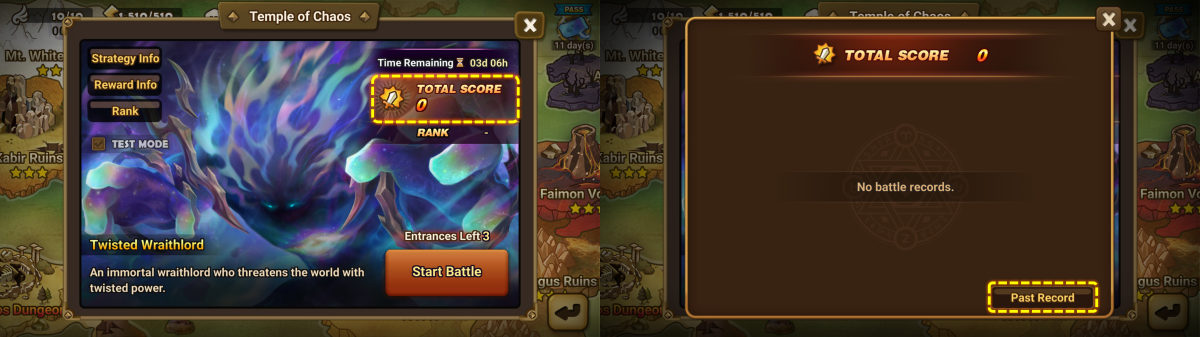 : Dans la fenêtre d’information du Temple du Chaos, en appuyant sur la zone [Score total], un nouvel élément d’interface permettant de consulter les « Scores précédents » apparaît en bas du pop-up détaillé.