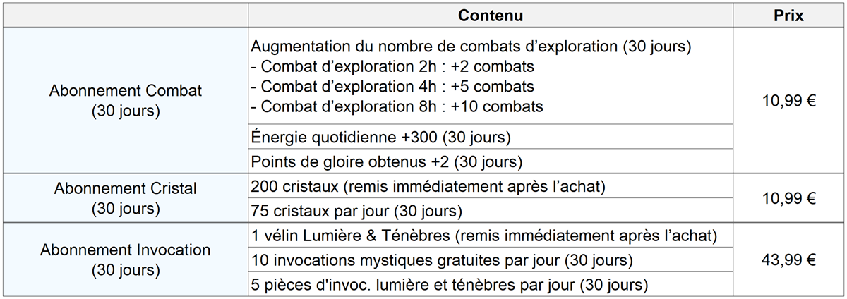 - Voici la présentation des nouveaux Abonnement Combat / Abonnement Cristal / Abonnement Invocation :