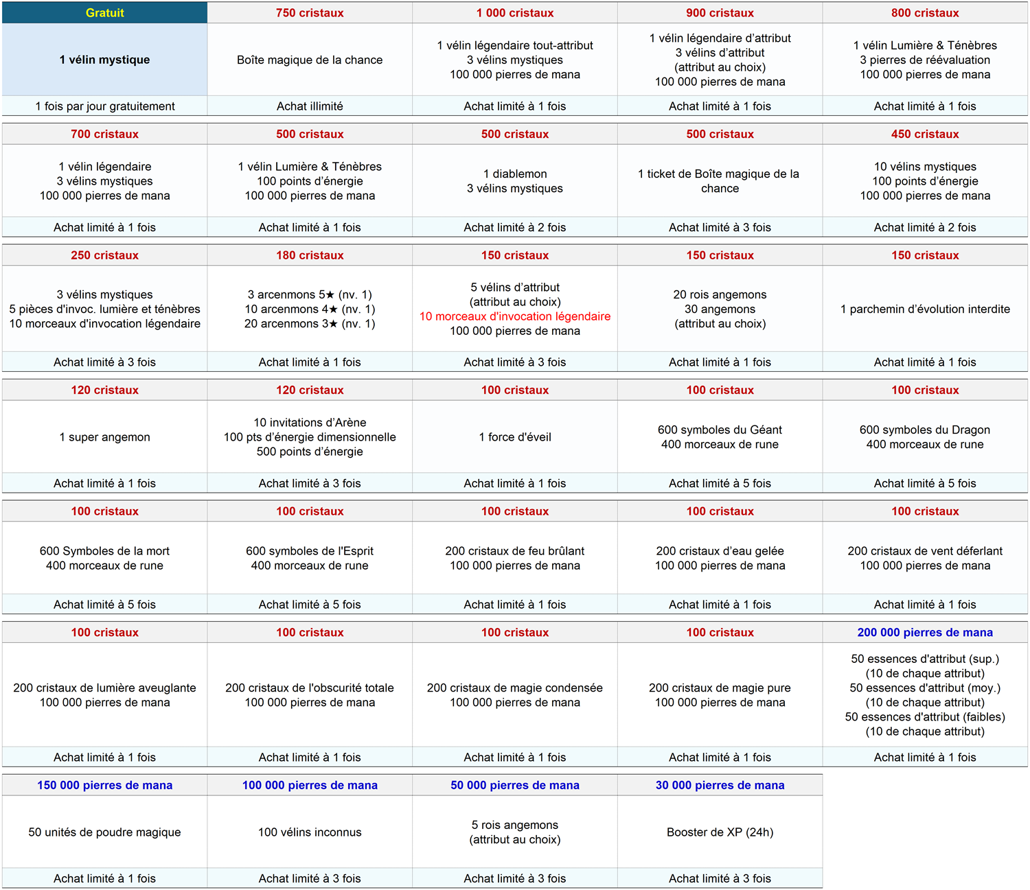 ※ Pour les runes 6★ légendaires vendues dans les offres hebdomadaires, vous pourrez choisir le numéro et la propriété principale de la rune lors de sa réception dans la boîte aux lettres.