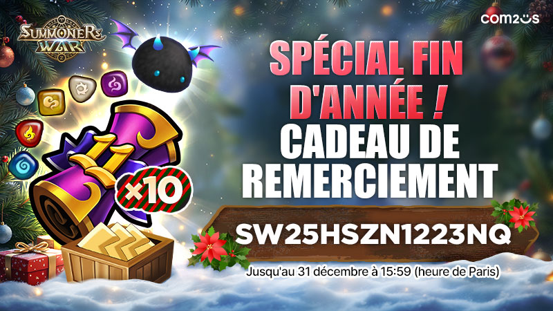 Saisissez le code coupon pendant la période indiquée ci-dessous et passez une merveilleuse fin d’année avec Summoners War.