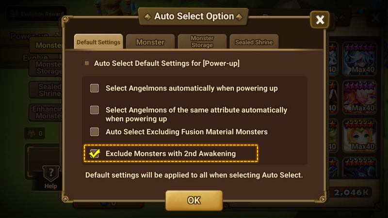 - Dans la [Stèle d’amélioration], une option a été ajoutée afin d’exclure les monstres pouvant effectuer un 2e éveil des options de sélection automatique lors de l’amélioration/évolution de monstres.