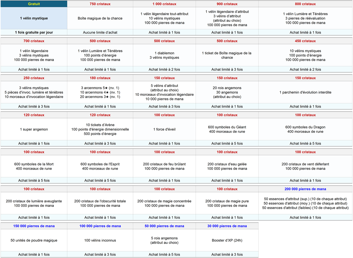 - La liste des articles disponibles dans la Boutique surprise est la suivante.
