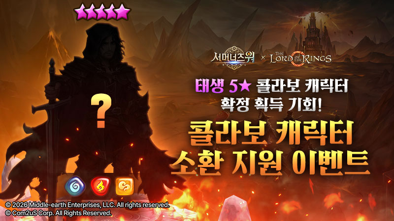 안녕하세요, GM 아이린입니다.서머너즈 워 X 반지의 제왕 콜라보 기념![태생 5★ 콜라보 캐릭터 확정 획득 기회! 콜라보 캐릭터 소환 지원 이벤트]가 진행됩니다.이벤트 기간 동안 소환서를 사용하고 포인트를 획득하여 [태생 5★ 불·물·바람 콜라보 캐릭터 랜덤 1종]을 확정으로 획득해 보세요!자세한 내용은 아래를 확인해 주세요.■ 이벤트 기간각 서버별 업데이트 이후 ~ 2026-03-31 (화) 23:59 (KST)선물 수령 종료일 : 2026-04-01 (수) 23:59 (KST)■ 이벤트 내용이벤트 기간 동안 소환서를 사용하고 포인트를 획득하여 [태생 5★ 불·물·바람 콜라보 캐릭터 랜덤 1종]을 포함한 선물들을 획득해 보세요![포인트 획득 방법]- 태생 3★~5★ 소환서로 몬스터 소환 시 : 1p- 태생 4★~5★ 소환서로 몬스터 소환 시 : 3p- 태생 5★ 소환서로 몬스터 소환 시 : 5p[보너스 포인트 획득 방법]- 콜라보 캐릭터 소환 시 : 50p* 몬스터 소환 결과가 아닌 사용하는 소환서 종류에 따라 포인트가 카운트됩니다.* 몬스터 조각이나 만능 소환서 조각은 포인트 카운트에 포함되지 않습니다.* 크리스탈을 소모하는 신비 소환은 포인트 카운트에 포함되지 않습니다. * 소환 멤버십으로 무료 신비 소환을 진행 경우 포인트 카운트에 포함됩니다.* <콜라보 기념! 태생 5★ MAX 스킬 레벨 업, 진화, 강화 프로도 지급 이벤트>에서 획득하신 [물 속성 프로도]는 소환한 콜라보 캐릭터 카운트에 포함되지 않습니다.[포인트 별 획득 가능한 선물 리스트]1000p : 신비의 소환서x102000p : 신비의 소환서x103000p : 태생 5★ 불·물·바람 콜라보 캐릭터 랜덤 1종 중 확정 소환!★ 소환 가능한 태생 5★ 불·물·바람 반지의 제왕 콜라보 캐릭터 리스트 ★* 이미 소환한 콜라보 캐릭터도 중복으로 소환될 수 있습니다.※ 필독사항- 보상 수령은 이벤트 종료 이후 24시간까지 가능합니다.- 이벤트 시작 시간에 게임에 접속 중이신 경우 이벤트 적용이 지연될 수 있습니다. 재 접속 후 참여해주세요.- 선물이 확인되지 않으실 경우, 번거로우시겠지만 재 접속 후 우편함을 확인 부탁드립니다.- 이벤트 기간 및 남은 시간은 거주지 국가 시간으로 표기됩니다.- 이벤트 문의: 컴투스 고객센터 1:1 문의 https://customer.withhive.com/com2us/ask/313​