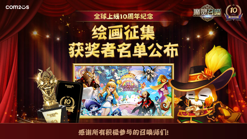 大家好,我是你们的艾琳。向所有参加全球上线10周年纪念绘画征集活动的召唤师表示衷心的感谢!此次活动旨在回顾与魔灵召唤共同度过的10年,征集自由描绘10周年纪念贺图或召唤师经历的最佳瞬间的绘画作品!许多召唤师送来了饱含珍贵心意的优秀作品,为魔灵召唤全球上线10周年更添光彩。此次绘画征集活动的所有获奖作品将通过[获奖作品展示会]页面进行更详细的介绍,请在游戏内欣赏精彩作品,观看[10周年绘画征集获奖作品介绍视频],领取3张神秘召唤书吧!<观看10周年绘画征集获奖作品介绍视频>https://www.bilibili.com/video/BV1UM4m1y7Am/* 需要观看10周年绘画征集获奖作品展示会页面中的视频,才能获得[神秘召唤书x3]。请务必通过此页面进行领取。 可在游戏内天空之城右侧活动图标 > 活动 > 全球上线10周年纪念绘画征集获奖作品展示会页面中查看详情。那么现在公布大家期待已久的获奖作品!* 获奖作品不分两个领域而是综合进行评选。☆ 大奖 (10名):奖金 1,000 $ + 10周年纪念奖杯x1,水晶+500-WANISM- (10周年纪念贺图领域 / 亚洲服务器)串仙贝 (10周年纪念贺图领域 / 中国服务器)闇之羽 (10周年纪念贺图领域 / 亚洲服务器)왜초기화됨? (最棒的瞬间 / 韩国服务器)BoyInscarlet (10周年纪念贺图领域 / 全球服务器)Chonky_ShyGuy (10周年纪念贺图领域 / 全球服务器)Kitseru-san (10周年纪念贺图领域 / 欧洲服务器)KURISUKE (10周年纪念贺图领域 / 日本服务器)NKayTee (10周年纪念贺图领域 / 亚洲服务器)タエローン (10周年纪念贺图领域 / 日本服务器)★ 优秀奖(30名):10周年纪念奖杯x1,水晶+500★ 鼓励奖(60名):水晶+300祝贺获奖的所有召唤师,再次感谢大家对全球上线10周年绘画征集活动的关系与支持![大奖、优秀奖确认事项] 对于获得大奖、优秀奖的召唤师们,将在公布获奖者后,通过参加活动时填写的联系方式(邮箱或手机号码),发送奖金及奖品配送相关信息收集表。请确认收到的邮件,并在8/4(周日)22:59之前填写邮件中的表格并回复。* 大奖获奖者请填写联系时引导的谷歌表单后,附上支付奖金的存折复印件等进行回复。* 如果在奖品邮件回复截止期间未表明领取意向,则视为无领取意向,取消获奖资格。* 根据居住地区的配送情况,实物奖品的配送可能会困难,届时将另行通知。* 获得大奖、优秀奖,但在3天内未收到邮件或电话联系时请咨询客服中心。------------------------------------------------------------------------※注意事项※- 10周年纪念奖杯中包含 [光暗召唤书x1, 恶魔怪x1,水晶+500,神秘召唤书x10]优惠券。 - 除实物奖品外,游戏内奖励将在7/25(周四)左右依次发送到游戏内收件箱。- 未遵守活动参与守则的作品被排除在获奖名单之外。- 提供的召唤师名称或服务器名称有误时,将无法获得奖励。:举例1)支付奖励时的召唤师名称与所提供信息的召唤师名称不同或被删除时:举例2)因召唤师名称包含特殊文字导致无法确认信息时