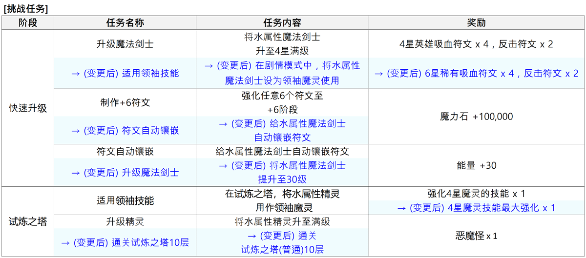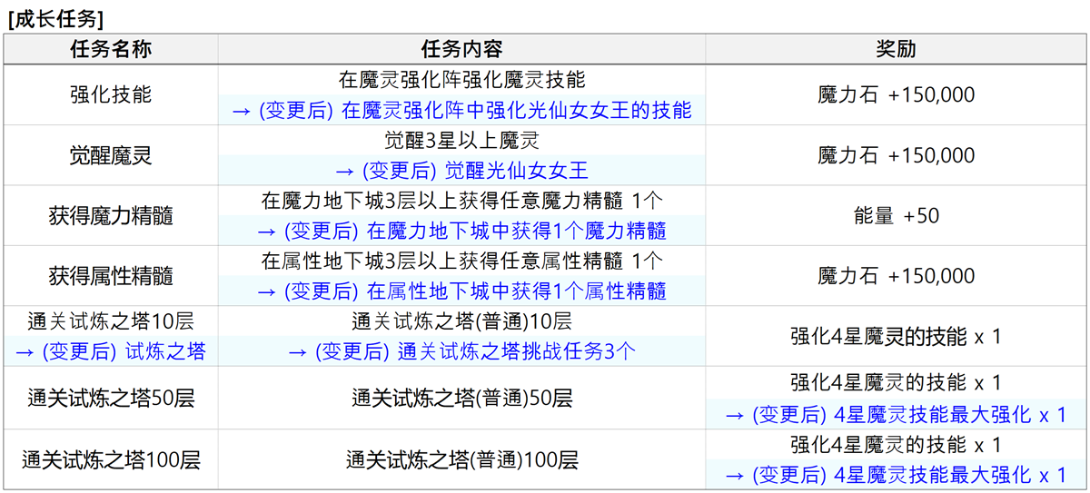 :部分任务已进行调整,原先提供的[强化4星魔灵的技能(1次)]奖励,已变更为[4星魔灵技能最大强化]全新奖励。