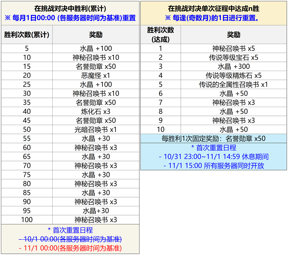 - [挑战对决奖励(累计胜利)]:每月1日00:00 (各服务器时间为基准)重置。
