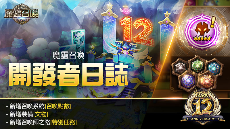 EVENT [通知] 12週年更新開發者日誌親愛的召喚師您好 每當新的一年到來、春暖花開之際,我們總會回顧與召喚師們一同走過的時光。 正因為有各位的陪伴,春分時節對我們而言更顯得特別且充滿感謝。 在即將到來的4月17日,將迎來《魔靈召喚》的第12個生日。 在這12年的時光裡,正是因為召喚師們的喜愛與支持,才造就了今日的《魔靈召喚》。 在此由衷地向大家致上最深的感謝。 本次的開發者日誌中,我們將為各位介紹12週年專屬紀念慶典最新消息,以及同步進行的更新內容。 在此之前,為了各位引頸期盼12週年紀念慶典的召喚師,我們亦準備了12週年預告影片,請透過下方連結觀看。 [▶《魔靈召喚》12週年紀念預告影片◀] 接下來將為各位說明歡慶12週年,天空之島所帶來的各項變化。 首先,是12週年紀念慶典相關消息。 ■ 《魔靈召喚》12週年紀念慶典火熱開跑 - 活動期間:4月13日 ~ 5月31日 ▶ 天空之島將新增12週年紀念舞台及各種特效 伴隨歡慶《魔靈召喚》12週年的舞台,天空之島將登場充滿節慶氛圍的面板、煙火秀與雷射效果等演出。 在舞台上,將可直接欣賞套用偶像變形幻影的瓦爾基里、地獄夫人、環刃舞女、旋刀武姬及刺客的精彩演出。透過天空之島上的大型展示面板與魔靈們生動的舞台表現相互呼應,我們精心打造出讓召喚師能盡情享受多彩12週年慶典氛圍的天空之島。 該活動期間舞台陣容將定期更換,並帶來多樣化的特效演出。期待偶像變形幻影魔靈們帶來的不同舞台,為《魔靈召喚》增添更多樂趣。 ▶ 12週年紀念美人魚特別變形幻影大方送 每逢週年慶都不會缺席的特別變形幻影,今年亦如期登場。 本次12週年變形幻影的主角,為符合12週年慶典氛圍特別形象的美人魚。 夢幻氛圍中,輕盈盤坐在宛如月亮般神秘物體上的形態,正是名為「月之星」的變形幻影。 預計透過12週年紀念活動發放,務必把握入手大好機會。 此外,月之星 美人魚亦將於12週年紀念舞台登場,各位可體驗雙重邂逅的特別感受。 ▶ 新增12種可將天空之島裝飾為慶典氛圍的12週年佈置道具 商店中將新增滿載12週年慶典氛圍的12種佈置道具。 該圖示中央可見舞台造型的佈置道具,十分引人注目。 該道具為可配置1隻指定魔靈的特別建築,最多可購買3個並設置於天空之島。 此外,配置套用偶像變形幻影的魔靈,或裝備12週年紀念變形幻影的美人魚等 本次登上12週年舞台的魔靈於該建築時,將以我們特別準備的專屬特效進行演出,帶來與眾不同的體驗。 不妨利用充滿12週年氛圍的各種佈置道具,打造專屬於你的獨一無二天空之島吧! 期待各位召喚師展現精彩的佈置創意! ▶ 將舉辦多項12週年紀念活動 點擊上述提及的舞台建築後,將展開可於同一處便利體驗12週年紀念活動及各種內容的專屬空間,簡要說明如下。 [12週年紀念畫廊] 《魔靈召喚》的特別畫廊。 收錄與召喚師們一同冒險的魔靈未公開美術概念圖,及迄今為止的各式精彩內容! 不僅豐富多樣,且每日皆會公開全新內容,讓您每次登入時都能滿懷期待! [12週年簽到好禮] 於12週年紀念期間每日登入,即可獲得各種每日獎勵。 千萬別忘了進行每日登入,帶走所有獎勵! [12週年紀念影片] 為紀念12週年,我們也準備了特別預告影片。 可於建築內再次觀看,隨時重溫特別內容! 同時,也可至主頁一覽可直接前往12週年紀念活動頁面的選單,以及活動掉落道具的現況。 於慶典期間中,可使用獲得的掉落道具兌換各式各樣的獎勵,請務必於活動期間內把握機會領取。 12週年紀念特別活動的詳細內容,預計將於4月10日(KST)另行說明。 敬請期待各種精彩豐富活動。 以上為12週年慶典的最新消息。 為歡慶12週年,我們在天空之島準備了豐富多彩的內容與活動,回應召喚師們長久以來的支持與喜愛, 接下來,就讓我們正式進入更新內容的介紹。 ■ 新增召喚點數系統 隨著持續進行召喚,可逐步召喚出原5星魔靈的全新召喚點數系統正式登場。 於魔靈召喚陣中每次使用召喚書時,皆會累計召喚點數, 依據使用的召喚書類型不同,所累計的召喚點數也會有所差異,當累計達2,000點時,即可加碼召喚1隻火/水/風屬性的原5星魔靈。 可累計點數的召喚書類型,及各召喚書所累計的點數值如下。 以下為新增召喚點數的魔靈召喚陣畫面。 在魔靈召喚陣選單中,將新增可顯示點數累計進度的圖示, 僅會於可累計召喚里程的召喚書項目中顯示該選單。 召喚點數累計完成時,將顯示如下畫面。 當點數累計完成即可進行5星召喚, 每累計2,000點可獲得1次召喚機會, 同時,點數可持續累計超過2,000點,超過的點數也無需擔心,可以隨時進行召喚,並於需要時再次使用點數進行5星召喚。 此外,使用點數進行5星召喚時,將不會套用[燦爛的召喚祝福],敬請特別留意。 我們希望讓召喚師們的每一次召喚都能比以往更具意義,故準備了本次的召喚點數系統, 包含神秘召喚書在內的大多數召喚書皆為點數累計對象,您可如往常般享受召喚的樂趣,並善用累計點數,更加輕鬆地入手所需的火/水/風5星魔靈。 接下來,將為各位介紹12週年更新的第二項內容—魔靈的全新裝備[文物]。 ■ 新增裝備:[文物] 繼符文與魔礦之後,《魔靈召喚》將新增魔靈的全新裝備[文物]。 首先,為各位針對文物進行簡要介紹。 如果說符文與魔礦是套用於單一魔靈的裝備, 那麼本次的文物則是可同時套用於最多100隻